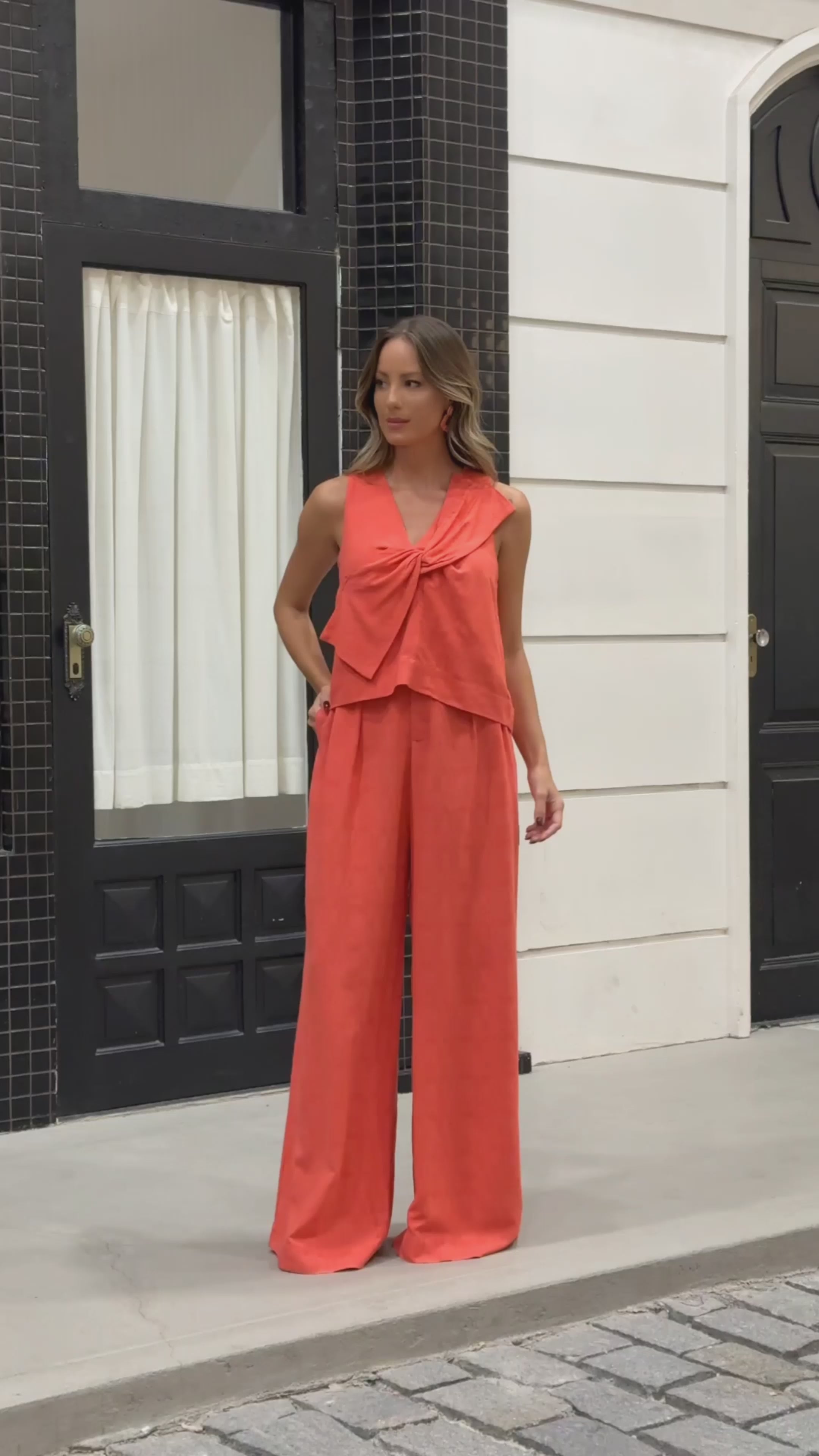 A blusa sem mangas possui decote delicado com detalhe frontal. A calça pantalona de modelagem ampla garante movimento, conforto e um visual alongado, tornando o conjunto perfeito para diversas ocasiões.