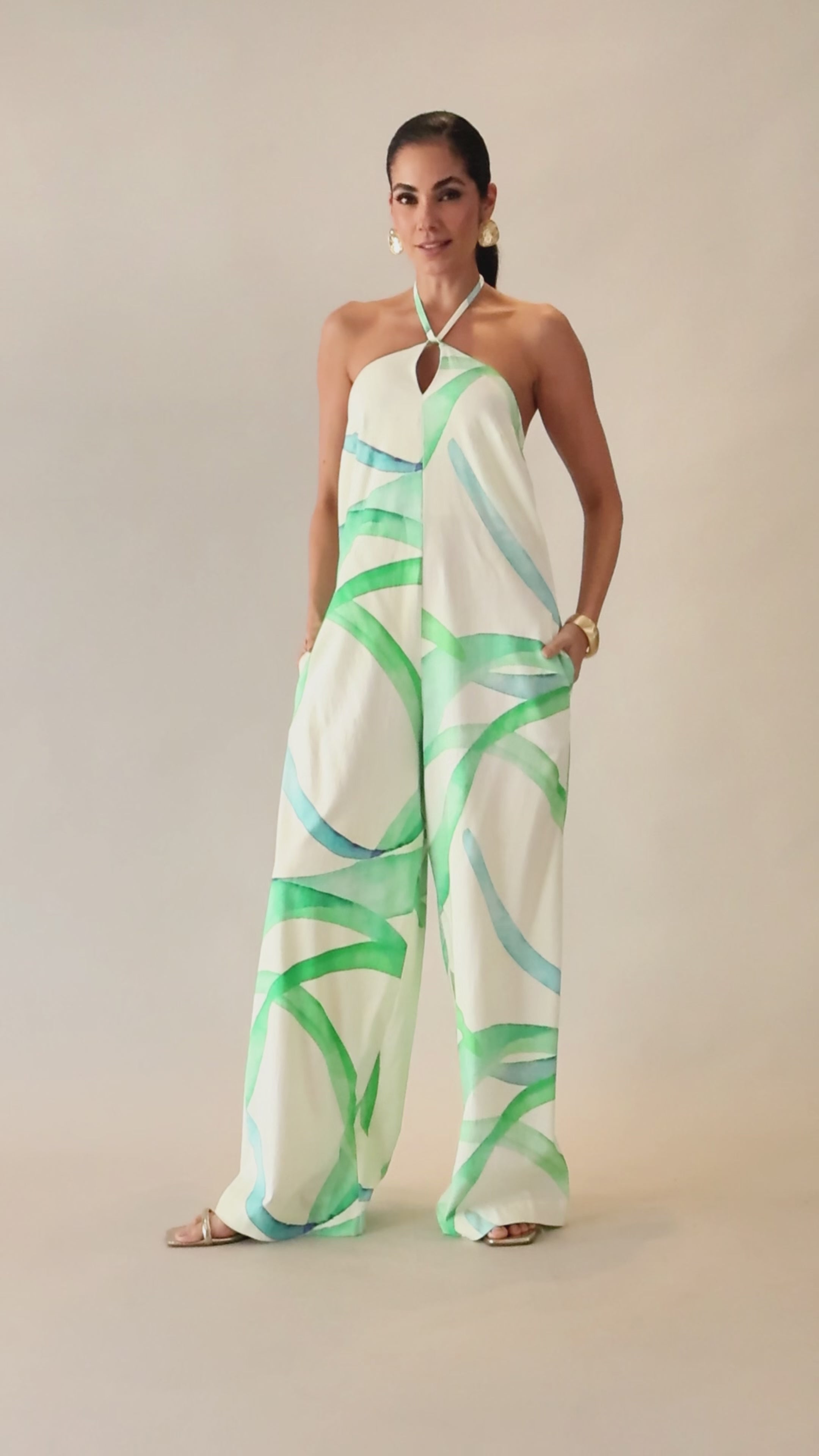 Macacão longo com estampa exclusiva de traços orgânicos em tons cítricos, que trazem um ar vibrante e sofisticado à peça. A modelagem ampla e decote halter com amarração no pescoço adiciona um toque moderno e elegante. Ideal para dias de verão e ocasiões que pedem um visual leve, fresco e cheio de estilo.