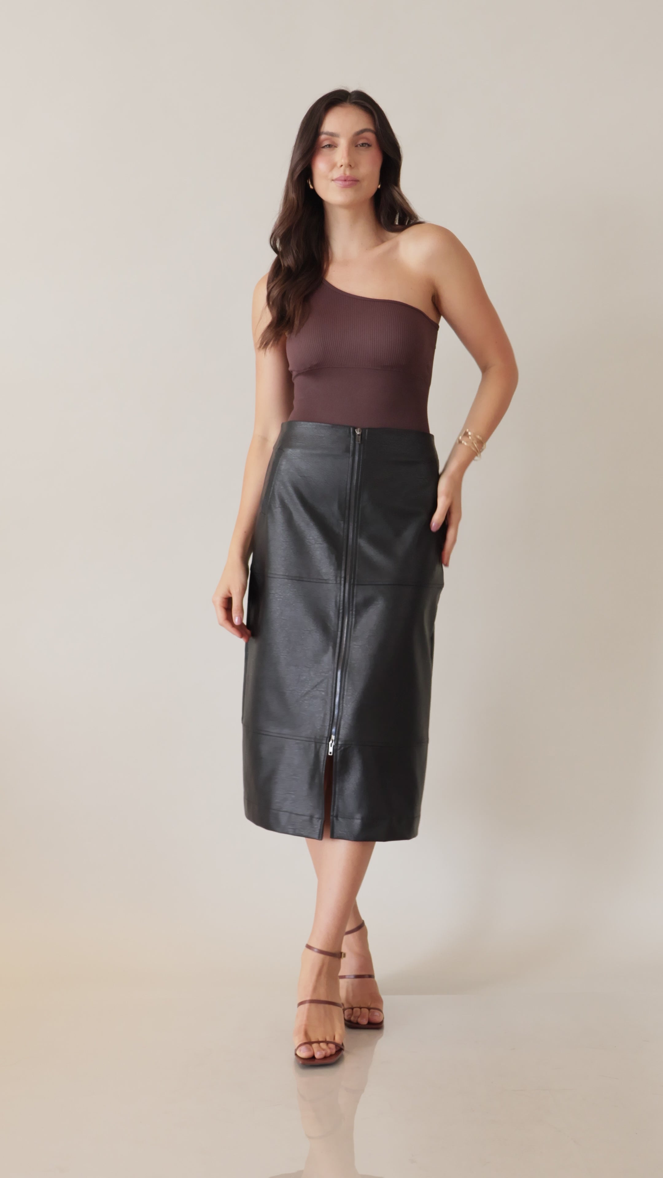 Saia midi de modelagem reta e estrutura impecável, toque macio e acabamento sofisticado. Possui fechamento frontal em zíper metálico aparente, que além de funcional traz um detalhe moderno e elegante à peça.