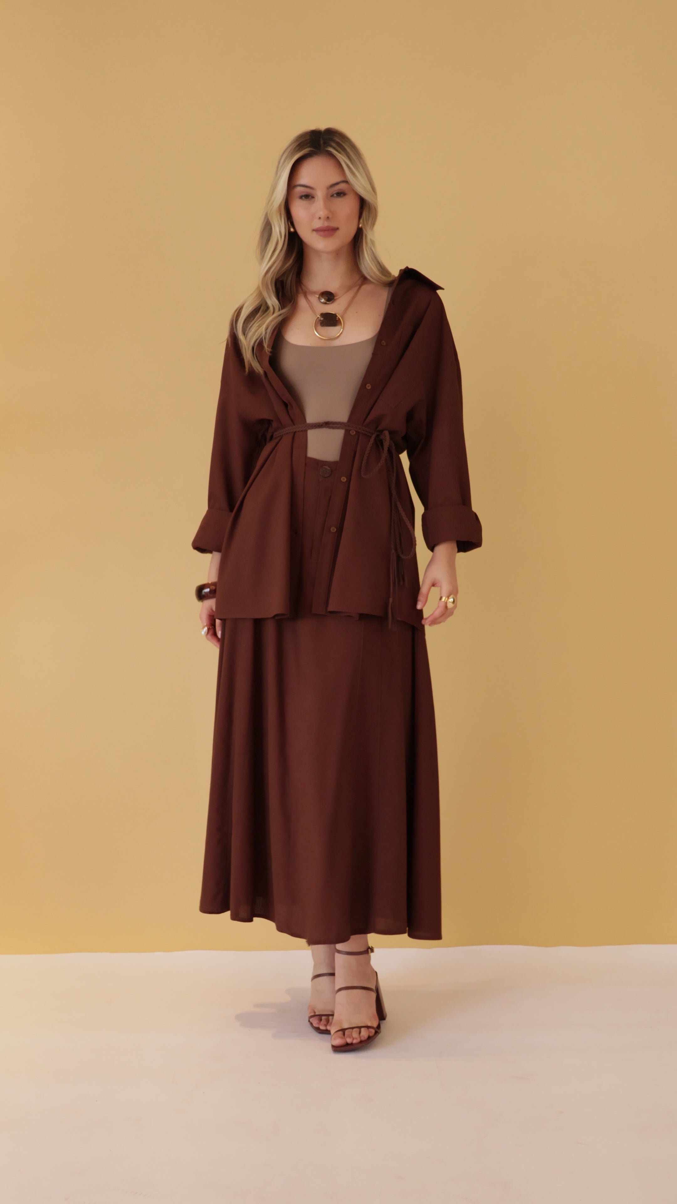 A modelagem levemente evasê cria uma silhueta elegante e confortável, enquanto a cintura marcada com cós estruturado garante melhor ajuste ao corpo. Possui fechamento frontal por botão e zíper, além de bolsos laterais funcionais que trazem praticidade ao dia a dia. Os recortes verticais alongam a silhueta e reforçam o caimento natural do tecido.